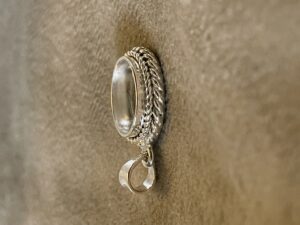 Dit melk juweel is een echt zilveren moedermelk sieraad. Het heeft een ovale vorm en de ruimte waar de moedermelk in gaat is 11 bij 9 mm. Dan zit er nog een sierlijke rand van 1 mm omheen. Het heeft een sierlijke rand wat een leuke uitstraling geeft.